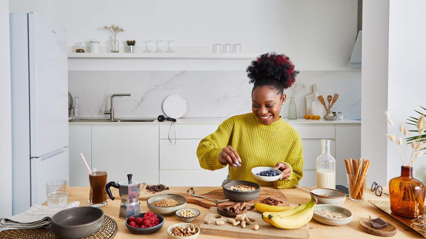 Mittags könne es dann beispielsweise eine Bowl mit Reis, aber auch wieder eiweißhaltigen Lebensmitteln geben, zum Beispiel Kichererbsen, Fisch, Tofu, Gemüse. „Gemüse hat immer viel Volumen, aber wenig Kalorien, also füllt auch den Magen. Das ist eine perfekte Kombination.“ Meist brauche es zwischendurch aber noch einen Snack. „Sonst ist es kein Wunder, wenn man ausgehungert von der Arbeit nach Hause kommt, dass man an den Kühlschrank rennt oder die Süßigkeiten-Schublade aufmacht.“ Ein guter Snack könnten dann eine Handvoll Nüsse sein, dazu ein Stück Obst. „Auch bei Snacks sollten Sie darauf achten, dass es nicht nur aus Kohlenhydraten besteht. Ein paar Blaubeeren und zwei Stücke dunkle Schokoladezum Beispiel.“ Abends kann es dann eine Scheibe Brot mit zwei Spiegeleiern sein. „Dazu vielleicht noch mal Salat, wenn man das gut verträgt. Oder gedünstetes Gemüse. Und wenn man dann vielleicht noch das Verlangen hat nach etwas Süßem, wäre ein Joghurt mit einem Stück Obst eine gute Wahl.“